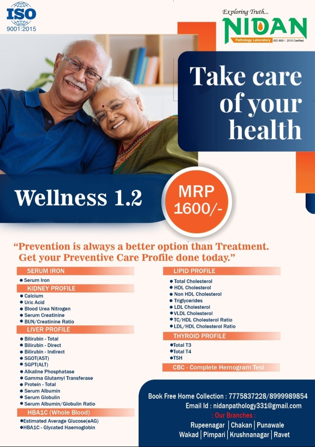 Glycosylated hemoglobin, also known as HbA1c or glycated hemoglobin, is a blood test that provides an average of your blood sugar (glucose) levels over the past two to three months. This test is used to diagnose prediabetes and type 1 or type 2 diabetes and to monitor how well diabetes is being managed over time. The test works because glucose naturally sticks to hemoglobin in red blood cells, and the higher your blood sugar levels, the more glucose attaches to the hemoglobin. Since red blood cells have a lifespan of about 3 months, the HbA1c test reflects your average blood glucose over this period. A of blood tests used to assess the health of your liver, kidneys, heart, and iron levels. Liver Function Test (LFT) measures enzymes, proteins, and bilirubin to check for liver damage, inflammation, or disease. Kidney Function Test (KFT) (also called Renal Profile) assesses kidney health by checking creatinine, urea, and electrolytes. Lipid Profile measures cholesterol (LDL, HDL) and triglycerides to evaluate cardiovascular risk. Iron Test (often part of a comprehensive health checkup) assesses your iron levels to help detect anemia or iron overload. These tests, sometimes offered as a comprehensive health panel, are recommended for routine health screenings, monitoring chronic conditions like high blood pressure, diabetes, or obesity, or if symptoms of kidney or liver issues appear. Welcome to Nidan Pathology Laboratory, your trusted partner in comprehensive healthcare services., we specialize in delivering accurate pathology blood tests and preventive health check packages. Our commitment lies in providing accessible healthcare solutions to the residents of Pimpri Chinchwad Pune city. With a focus on convenience and affordability, we offer free home collection services, ensuring that healthcare remains convenient and accessible to all. Experience quality healthcare services at affordable prices with Nidan Pathology Laboratory – your trusted healthcare partner in Pimpri Chinchwad Pune. We are fast growing health care organization. A pioneer in the health care arena, Nidan Pathology Laboratory has been at the fore front of world class health care services. Our fundamental mission is to propagate healthier living for all our citizen. Nidan Pathology Laboratory is doing a pivotal role in raising the bar of health diagnostic accuracy, technological equipment, customer experience and research-driven empathetic service in the health industry. The company runs health care services like-: pharmaceutical, herbal & nutraceutical company, other hand company also working with hospitals & clinic, diagnostics, ambulance services, blood bank, ngo, old age home care, pet care & medicine, nursing services, online medicine, online consultation, and also work with concept of health care @ the home services. In our country the healthcare industry is undergoing a revolutionary change due to the increasing awareness about lifestyle disease, growth in gdp, knowledge about preventive healthcare, growing health insurance market, and growing government expences on healthcare. Why Choose Nidan Pathology Laboratory? Regular checkups are an essential part of maintaining good health. At our pathology lab, we offer a comprehensive range of services to help you stay on top of your health game. Our team of experts is committed to providing you with the highest level of care and support, using the latest technology and techniques. Mission, Vision, Value MISSION A reliable, one-stop-solution for all healthcare needs of all categories of patients. To create impact by becoming an active participant in local community initiatives and contribute to its well-being and development. Vision At Nidan Pathology Laboratory we aim to dedicate ourselves to human care through excellence in health care services and improving health standards through preventive care. Value QUALITY EFFICIENCY COST INNOVATION DEPENDABILITY SPEED