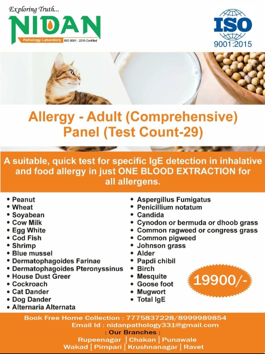 Allergy Test Types (IgE, IgG & Phadiatop), Purpose & PriceAn allergy comprehensive profile test is a blood test that measures specific immunoglobulin E (IgE) antibodies to identify potential triggers for allergic reactions, such as foods, environmental allergens like dust mites or pollen, and animal dander. By detecting elevated IgE levels in response to specific allergens, this test provides doctors with a broad view of a patient's allergies, enabling them to create effective management and treatment plans Welcome to Nidan Pathology Laboratory, your trusted partner in comprehensive healthcare services., we specialize in delivering accurate pathology blood tests and preventive health check packages. Our commitment lies in providing accessible healthcare solutions to the residents of Pimpri Chinchwad Pune city. With a focus on convenience and affordability, we offer free home collection services, ensuring that healthcare remains convenient and accessible to all. Experience quality healthcare services at affordable prices with Nidan Pathology Laboratory – your trusted healthcare partner in Pimpri Chinchwad Pune. We are fast growing health care organization. A pioneer in the health care arena, Nidan Pathology Laboratory has been at the fore front of world class health care services. Our fundamental mission is to propagate healthier living for all our citizen. Nidan Pathology Laboratory is doing a pivotal role in raising the bar of health diagnostic accuracy, technological equipment, customer experience and research-driven empathetic service in the health industry. The company runs health care services like-: pharmaceutical, herbal & nutraceutical company, other hand company also working with hospitals & clinic, diagnostics, ambulance services, blood bank, ngo, old age home care, pet care & medicine, nursing services, online medicine, online consultation, and also work with concept of health care @ the home services. In our country the healthcare industry is undergoing a revolutionary change due to the increasing awareness about lifestyle disease, growth in gdp, knowledge about preventive healthcare, growing health insurance market, and growing government expences on healthcare. Why Choose Nidan Pathology Laboratory? Regular checkups are an essential part of maintaining good health. At our pathology lab, we offer a comprehensive range of services to help you stay on top of your health game. Our team of experts is committed to providing you with the highest level of care and support, using the latest technology and techniques. Mission, Vision, Value MISSION A reliable, one-stop-solution for all healthcare needs of all categories of patients. To create impact by becoming an active participant in local community initiatives and contribute to its well-being and development. Vision At Nidan Pathology Laboratory we aim to dedicate ourselves to human care through excellence in health care services and improving health standards through preventive care. Value QUALITY EFFICIENCY COST INNOVATION DEPENDABILITY SPEED