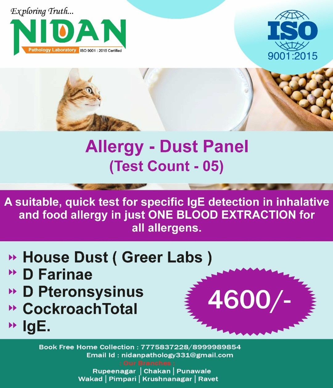 An Allergy Dust Panel is a blood test that identifies specific IgE antibodies to common dust components, such as house dust mites (Dermatophagoides farinae and D. pteronyssinus) and cockroaches, helping doctors diagnose the cause of allergy symptoms like sneezing and coughing. The test uses ImmunoCAP technology to measure the IgE levels and determine the severity of the allergic reaction, guiding the development of a targeted treatment plan. What the test measures Specific IgE Antibodies: The test detects the presence and levels of IgE antibodies in your blood that are specific to different dust-related allergens. Common Dust Allergens: The panel typically tests for: Dermatophagoides farinae (a type of house dust mite) Dermatophagoides pteronyssinus (another common house dust mite) Cockroach allergens Greer Labs House Dust (a specific mixture of dust particles) Total IgE: Some panels may also include a measurement of Total IgE, which can indicate a general allergy. Why the test is done To identify the specific components of dust causing your allergic symptoms. To help doctors create a personalized treatment plan. To diagnose allergies when symptoms are unclear or unexplained. To assess the severity of your allergic reaction. Symptoms that may lead to the test Sneezing, runny nose, and nasal congestion Itchy or watery eyes Coughing or wheezing Skin rashes or hives Welcome to Nidan Pathology Laboratory, your trusted partner in comprehensive healthcare services., we specialize in delivering accurate pathology blood tests and preventive health check packages. Our commitment lies in providing accessible healthcare solutions to the residents of Pimpri Chinchwad Pune city. With a focus on convenience and affordability, we offer free home collection services, ensuring that healthcare remains convenient and accessible to all. Experience quality healthcare services at affordable prices with Nidan Pathology Laboratory – your trusted healthcare partner in Pimpri Chinchwad Pune. We are fast growing health care organization. A pioneer in the health care arena, Nidan Pathology Laboratory has been at the fore front of world class health care services. Our fundamental mission is to propagate healthier living for all our citizen. Nidan Pathology Laboratory is doing a pivotal role in raising the bar of health diagnostic accuracy, technological equipment, customer experience and research-driven empathetic service in the health industry. The company runs health care services like-: pharmaceutical, herbal & nutraceutical company, other hand company also working with hospitals & clinic, diagnostics, ambulance services, blood bank, ngo, old age home care, pet care & medicine, nursing services, online medicine, online consultation, and also work with concept of health care @ the home services. In our country the healthcare industry is undergoing a revolutionary change due to the increasing awareness about lifestyle disease, growth in gdp, knowledge about preventive healthcare, growing health insurance market, and growing government expences on healthcare. Why Choose Nidan Pathology Laboratory? Regular checkups are an essential part of maintaining good health. At our pathology lab, we offer a comprehensive range of services to help you stay on top of your health game. Our team of experts is committed to providing you with the highest level of care and support, using the latest technology and techniques. Mission, Vision, Value MISSION A reliable, one-stop-solution for all healthcare needs of all categories of patients. To create impact by becoming an active participant in local community initiatives and contribute to its well-being and development. Vision At Nidan Pathology Laboratory we aim to dedicate ourselves to human care through excellence in health care services and improving health standards through preventive care. Value QUALITY EFFICIENCY COST INNOVATION DEPENDABILITY SPEED