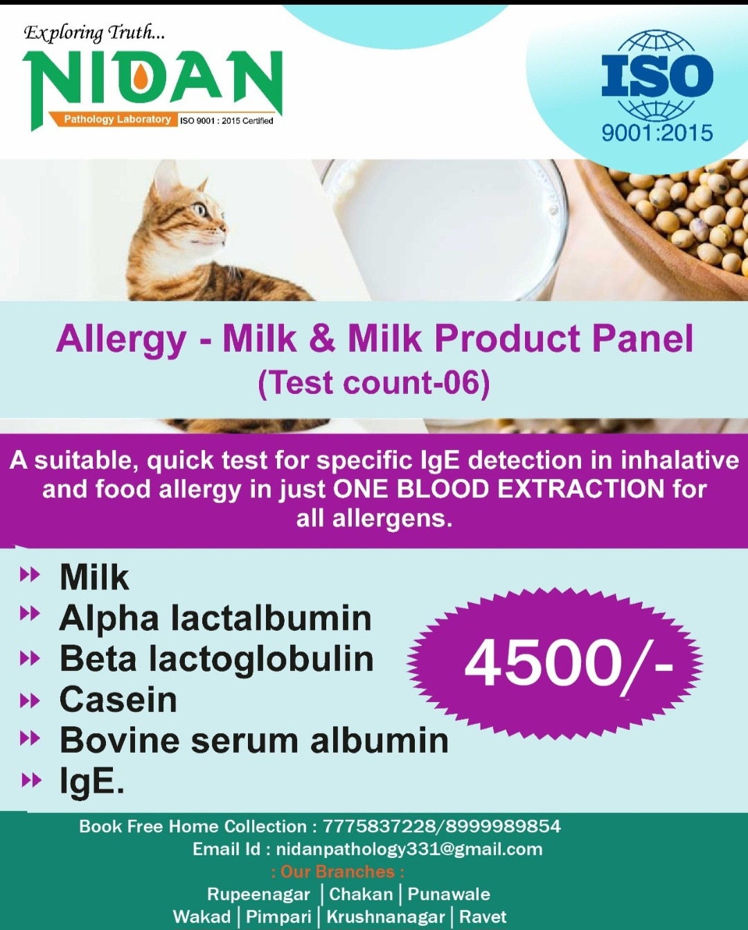 An allergy milk and milk product panel food test is a blood test that measures Immunoglobulin E (IgE) antibodies to specific milk proteins to identify a milk allergy. It identifies sensitivities to casein, alpha-lactalbumin, beta-lactoglobulin, and bovine serum albumin, and also measures total IgE levels. The test is recommended for individuals experiencing symptoms like hives, itching, diarrhea, vomiting, or respiratory problems after consuming milk or dairy products. What the test measures This blood test checks for an allergic immune response to specific proteins found in milk and dairy products: Casein: A major protein in milk. Alpha-lactalbumin: Another protein component of milk. Beta-lactoglobulin: A protein commonly found in cow's milk. Bovine serum albumin (BSA): A protein found in cow's milk. Total IgE: A measure of overall allergic tendency. Who should get the test You should consider this test if you have experienced symptoms of a milk or dairy allergy after consumption, such as: Skin symptoms: Hives, itching, swelling, or rashes. Digestive issues: Abdominal pain, diarrhea, or vomiting. Respiratory problems: Wheezing, coughing, or difficulty breathing. Severe reactions: In rare, severe cases, symptoms like fainting and difficulty breathing can occur. How the test is done Blood Sample Collection: A trained professional will take a blood sample from a vein in your arm. Lab Analysis: The sample is sent to a lab where the IgE antibody levels against the milk proteins are measured. What the results mean Positive Results: Higher levels of antibodies indicate a greater likelihood of an allergy to the tested milk proteins. Management: If you test positive, a healthcare professional may recommend avoiding milk and dairy products, and suggest alternative nutrient sources Welcome to Nidan Pathology Laboratory, your trusted partner in comprehensive healthcare services., we specialize in delivering accurate pathology blood tests and preventive health check packages. Our commitment lies in providing accessible healthcare solutions to the residents of Pimpri Chinchwad Pune city. With a focus on convenience and affordability, we offer free home collection services, ensuring that healthcare remains convenient and accessible to all. Experience quality healthcare services at affordable prices with Nidan Pathology Laboratory – your trusted healthcare partner in Pimpri Chinchwad Pune. We are fast growing health care organization. A pioneer in the health care arena, Nidan Pathology Laboratory has been at the fore front of world class health care services. Our fundamental mission is to propagate healthier living for all our citizen. Nidan Pathology Laboratory is doing a pivotal role in raising the bar of health diagnostic accuracy, technological equipment, customer experience and research-driven empathetic service in the health industry. The company runs health care services like-: pharmaceutical, herbal & nutraceutical company, other hand company also working with hospitals & clinic, diagnostics, ambulance services, blood bank, ngo, old age home care, pet care & medicine, nursing services, online medicine, online consultation, and also work with concept of health care @ the home services. In our country the healthcare industry is undergoing a revolutionary change due to the increasing awareness about lifestyle disease, growth in gdp, knowledge about preventive healthcare, growing health insurance market, and growing government expences on healthcare. Why Choose Nidan Pathology Laboratory? Regular checkups are an essential part of maintaining good health. At our pathology lab, we offer a comprehensive range of services to help you stay on top of your health game. Our team of experts is committed to providing you with the highest level of care and support, using the latest technology and techniques. Mission, Vision, Value MISSION A reliable, one-stop-solution for all healthcare needs of all categories of patients. To create impact by becoming an active participant in local community initiatives and contribute to its well-being and development. Vision At Nidan Pathology Laboratory we aim to dedicate ourselves to human care through excellence in health care services and improving health standards through preventive care. Value QUALITY EFFICIENCY COST INNOVATION DEPENDABILITY SPEED