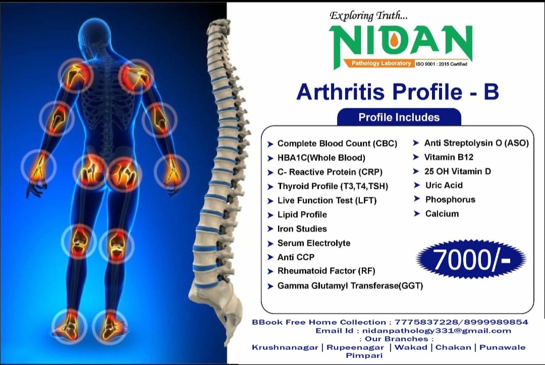An Arthritis Profile test is a combination of blood and, sometimes, imaging tests used to help diagnose different types of arthritis, assess inflammation, and monitor disease progression. Common components include tests for inflammation (like CRP and ESR), autoimmune markers (such as ANA and Rheumatoid Factor), uric acid levels for gout, and a general Complete Blood Count (CBC) to check for anemia. The specific tests included can vary depending on the provider and the suspected type of arthritis. Welcome to Nidan Pathology Laboratory, your trusted partner in comprehensive healthcare services., we specialize in delivering accurate pathology blood tests and preventive health check packages. Our commitment lies in providing accessible healthcare solutions to the residents of Pimpri Chinchwad Pune city. With a focus on convenience and affordability, we offer free home collection services, ensuring that healthcare remains convenient and accessible to all. Experience quality healthcare services at affordable prices with Nidan Pathology Laboratory – your trusted healthcare partner in Pimpri Chinchwad Pune. We are fast growing health care organization. A pioneer in the health care arena, Nidan Pathology Laboratory has been at the fore front of world class health care services. Our fundamental mission is to propagate healthier living for all our citizen. Nidan Pathology Laboratory is doing a pivotal role in raising the bar of health diagnostic accuracy, technological equipment, customer experience and research-driven empathetic service in the health industry. The company runs health care services like-: pharmaceutical, herbal & nutraceutical company, other hand company also working with hospitals & clinic, diagnostics, ambulance services, blood bank, ngo, old age home care, pet care & medicine, nursing services, online medicine, online consultation, and also work with concept of health care @ the home services. In our country the healthcare industry is undergoing a revolutionary change due to the increasing awareness about lifestyle disease, growth in gdp, knowledge about preventive healthcare, growing health insurance market, and growing government expences on healthcare. Why Choose Nidan Pathology Laboratory? Regular checkups are an essential part of maintaining good health. At our pathology lab, we offer a comprehensive range of services to help you stay on top of your health game. Our team of experts is committed to providing you with the highest level of care and support, using the latest technology and techniques. Mission, Vision, Value MISSION A reliable, one-stop-solution for all healthcare needs of all categories of patients. To create impact by becoming an active participant in local community initiatives and contribute to its well-being and development. Vision At Nidan Pathology Laboratory we aim to dedicate ourselves to human care through excellence in health care services and improving health standards through preventive care. Value QUALITY EFFICIENCY COST INNOVATION DEPENDABILITY SPEED