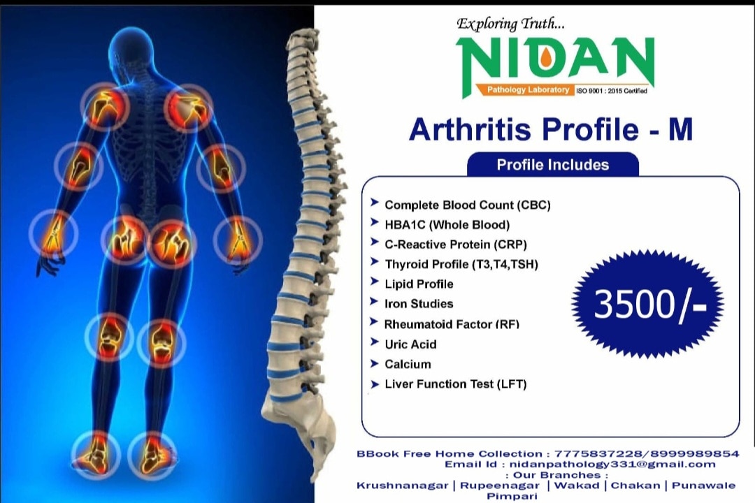 An Arthritis Profile test is a combination of blood and, sometimes, imaging tests used to help diagnose different types of arthritis, assess inflammation, and monitor disease progression. Common components include tests for inflammation (like CRP and ESR), autoimmune markers (such as ANA and Rheumatoid Factor), uric acid levels for gout, and a general Complete Blood Count (CBC) to check for anemia. The specific tests included can vary depending on the provider and the suspected type of arthritis. Welcome to Nidan Pathology Laboratory, your trusted partner in comprehensive healthcare services., we specialize in delivering accurate pathology blood tests and preventive health check packages. Our commitment lies in providing accessible healthcare solutions to the residents of Pimpri Chinchwad Pune city. With a focus on convenience and affordability, we offer free home collection services, ensuring that healthcare remains convenient and accessible to all. Experience quality healthcare services at affordable prices with Nidan Pathology Laboratory – your trusted healthcare partner in Pimpri Chinchwad Pune. We are fast growing health care organization. A pioneer in the health care arena, Nidan Pathology Laboratory has been at the fore front of world class health care services. Our fundamental mission is to propagate healthier living for all our citizen. Nidan Pathology Laboratory is doing a pivotal role in raising the bar of health diagnostic accuracy, technological equipment, customer experience and research-driven empathetic service in the health industry. The company runs health care services like-: pharmaceutical, herbal & nutraceutical company, other hand company also working with hospitals & clinic, diagnostics, ambulance services, blood bank, ngo, old age home care, pet care & medicine, nursing services, online medicine, online consultation, and also work with concept of health care @ the home services. In our country the healthcare industry is undergoing a revolutionary change due to the increasing awareness about lifestyle disease, growth in gdp, knowledge about preventive healthcare, growing health insurance market, and growing government expences on healthcare. Why Choose Nidan Pathology Laboratory? Regular checkups are an essential part of maintaining good health. At our pathology lab, we offer a comprehensive range of services to help you stay on top of your health game. Our team of experts is committed to providing you with the highest level of care and support, using the latest technology and techniques. Mission, Vision, Value MISSION A reliable, one-stop-solution for all healthcare needs of all categories of patients. To create impact by becoming an active participant in local community initiatives and contribute to its well-being and development. Vision At Nidan Pathology Laboratory we aim to dedicate ourselves to human care through excellence in health care services and improving health standards through preventive care. Value QUALITY EFFICIENCY COST INNOVATION DEPENDABILITY SPEED