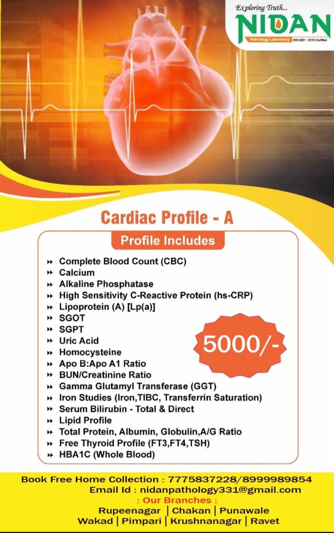 CARDIAC PROFILE C :A cardiac profile test is a diagnostic assessment that evaluates overall heart and circulatory system health by measuring specific blood biomarkers like cholesterol, lipids, and enzymes, and sometimes includes ECG (electrocardiogram) and echocardiogram to detect conditions that increase the risk of heart attack or disease. It helps monitor cardiac biomarkers, identify risk factors, and can be a routine check-up for those over 40 or with symptoms like chest pain or breathlessness. What a Cardiac Profile Test Checks For The specific components of a cardiac profile can vary, but often include tests for: Lipid Profile: Measures levels of cholesterol and fats (lipids) in the blood, which are important indicators of heart health. Cardiac Enzymes: Such as CPK-MB (Creatine Phosphokinase-MB) and LDH (Lactate Dehydrogenase), which can signal damage to heart muscle. High-sensitivity C-Reactive Protein (hsCRP): An indicator of inflammation in the body that may be linked to heart disease risk. Homocysteine: A compound in the blood that, at high levels, can increase the risk of cardiovascular disease. Liver Function Tests (LFT) & Kidney Function Tests (KFT): Included in comprehensive cardiac profiles to assess overall health. Why It's Performed Risk Assessment: To determine a person's likelihood of developing heart disease within a 10-year timeframe. Early Detection: To identify early signs of heart-related problems before serious complications arise. Monitoring: To monitor the health of the heart in individuals with existing heart conditions or those at high risk. Symptom Evaluation: To help diagnose the cause of symptoms such as chest pain, shortness of breath, fatigue, or swelling. Who Should Get One Adults over the age of 40. Individuals experiencing symptoms like chest pain, breathlessness, heart palpitations, or fatigue. People with known risk factors for heart disease, including a family history or other underlying conditions. Welcome to Nidan Pathology Laboratory, your trusted partner in comprehensive healthcare services., we specialize in delivering accurate pathology blood tests and preventive health check packages. Our commitment lies in providing accessible healthcare solutions to the residents of Pimpri Chinchwad Pune city. With a focus on convenience and affordability, we offer free home collection services, ensuring that healthcare remains convenient and accessible to all. Experience quality healthcare services at affordable prices with Nidan Pathology Laboratory – your trusted healthcare partner in Pimpri Chinchwad Pune. We are fast growing health care organization. A pioneer in the health care arena, Nidan Pathology Laboratory has been at the fore front of world class health care services. Our fundamental mission is to propagate healthier living for all our citizen. Nidan Pathology Laboratory is doing a pivotal role in raising the bar of health diagnostic accuracy, technological equipment, customer experience and research-driven empathetic service in the health industry. The company runs health care services like-: pharmaceutical, herbal & nutraceutical company, other hand company also working with hospitals & clinic, diagnostics, ambulance services, blood bank, ngo, old age home care, pet care & medicine, nursing services, online medicine, online consultation, and also work with concept of health care @ the home services. In our country the healthcare industry is undergoing a revolutionary change due to the increasing awareness about lifestyle disease, growth in gdp, knowledge about preventive healthcare, growing health insurance market, and growing government expences on healthcare. Why Choose Nidan Pathology Laboratory? Regular checkups are an essential part of maintaining good health. At our pathology lab, we offer a comprehensive range of services to help you stay on top of your health game. Our team of experts is committed to providing you with the highest level of care and support, using the latest technology and techniques. Mission, Vision, Value MISSION A reliable, one-stop-solution for all healthcare needs of all categories of patients. To create impact by becoming an active participant in local community initiatives and contribute to its well-being and development. Vision At Nidan Pathology Laboratory we aim to dedicate ourselves to human care through excellence in health care services and improving health standards through preventive care. Value QUALITY EFFICIENCY COST INNOVATION DEPENDABILITY SPEED
