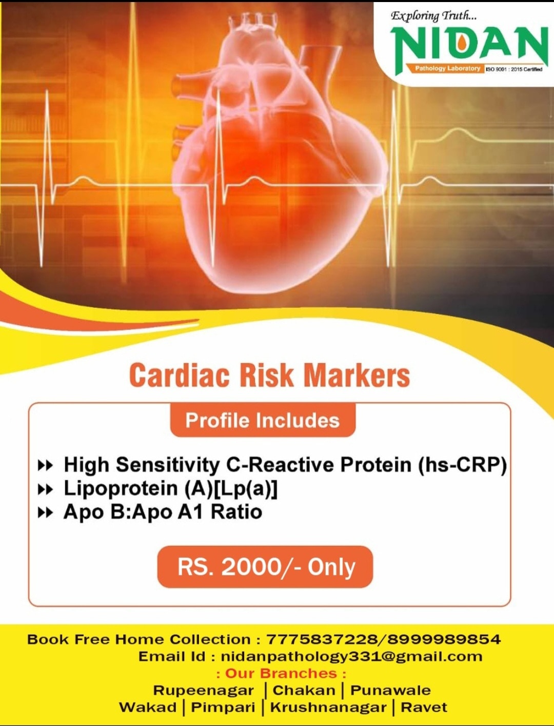 CARDIAC PROFILE C :A cardiac profile test is a diagnostic assessment that evaluates overall heart and circulatory system health by measuring specific blood biomarkers like cholesterol, lipids, and enzymes, and sometimes includes ECG (electrocardiogram) and echocardiogram to detect conditions that increase the risk of heart attack or disease. It helps monitor cardiac biomarkers, identify risk factors, and can be a routine check-up for those over 40 or with symptoms like chest pain or breathlessness. What a Cardiac Profile Test Checks For The specific components of a cardiac profile can vary, but often include tests for: Lipid Profile: Measures levels of cholesterol and fats (lipids) in the blood, which are important indicators of heart health. Cardiac Enzymes: Such as CPK-MB (Creatine Phosphokinase-MB) and LDH (Lactate Dehydrogenase), which can signal damage to heart muscle. High-sensitivity C-Reactive Protein (hsCRP): An indicator of inflammation in the body that may be linked to heart disease risk. Homocysteine: A compound in the blood that, at high levels, can increase the risk of cardiovascular disease. Liver Function Tests (LFT) & Kidney Function Tests (KFT): Included in comprehensive cardiac profiles to assess overall health. Why It's Performed Risk Assessment: To determine a person's likelihood of developing heart disease within a 10-year timeframe. Early Detection: To identify early signs of heart-related problems before serious complications arise. Monitoring: To monitor the health of the heart in individuals with existing heart conditions or those at high risk. Symptom Evaluation: To help diagnose the cause of symptoms such as chest pain, shortness of breath, fatigue, or swelling. Who Should Get One Adults over the age of 40. Individuals experiencing symptoms like chest pain, breathlessness, heart palpitations, or fatigue. People with known risk factors for heart disease, including a family history or other underlying conditions. Welcome to Nidan Pathology Laboratory, your trusted partner in comprehensive healthcare services., we specialize in delivering accurate pathology blood tests and preventive health check packages. Our commitment lies in providing accessible healthcare solutions to the residents of Pimpri Chinchwad Pune city. With a focus on convenience and affordability, we offer free home collection services, ensuring that healthcare remains convenient and accessible to all. Experience quality healthcare services at affordable prices with Nidan Pathology Laboratory – your trusted healthcare partner in Pimpri Chinchwad Pune. We are fast growing health care organization. A pioneer in the health care arena, Nidan Pathology Laboratory has been at the fore front of world class health care services. Our fundamental mission is to propagate healthier living for all our citizen. Nidan Pathology Laboratory is doing a pivotal role in raising the bar of health diagnostic accuracy, technological equipment, customer experience and research-driven empathetic service in the health industry. The company runs health care services like-: pharmaceutical, herbal & nutraceutical company, other hand company also working with hospitals & clinic, diagnostics, ambulance services, blood bank, ngo, old age home care, pet care & medicine, nursing services, online medicine, online consultation, and also work with concept of health care @ the home services. In our country the healthcare industry is undergoing a revolutionary change due to the increasing awareness about lifestyle disease, growth in gdp, knowledge about preventive healthcare, growing health insurance market, and growing government expences on healthcare. Why Choose Nidan Pathology Laboratory? Regular checkups are an essential part of maintaining good health. At our pathology lab, we offer a comprehensive range of services to help you stay on top of your health game. Our team of experts is committed to providing you with the highest level of care and support, using the latest technology and techniques. Mission, Vision, Value MISSION A reliable, one-stop-solution for all healthcare needs of all categories of patients. To create impact by becoming an active participant in local community initiatives and contribute to its well-being and development. Vision At Nidan Pathology Laboratory we aim to dedicate ourselves to human care through excellence in health care services and improving health standards through preventive care. Value QUALITY EFFICIENCY COST INNOVATION DEPENDABILITY SPEED