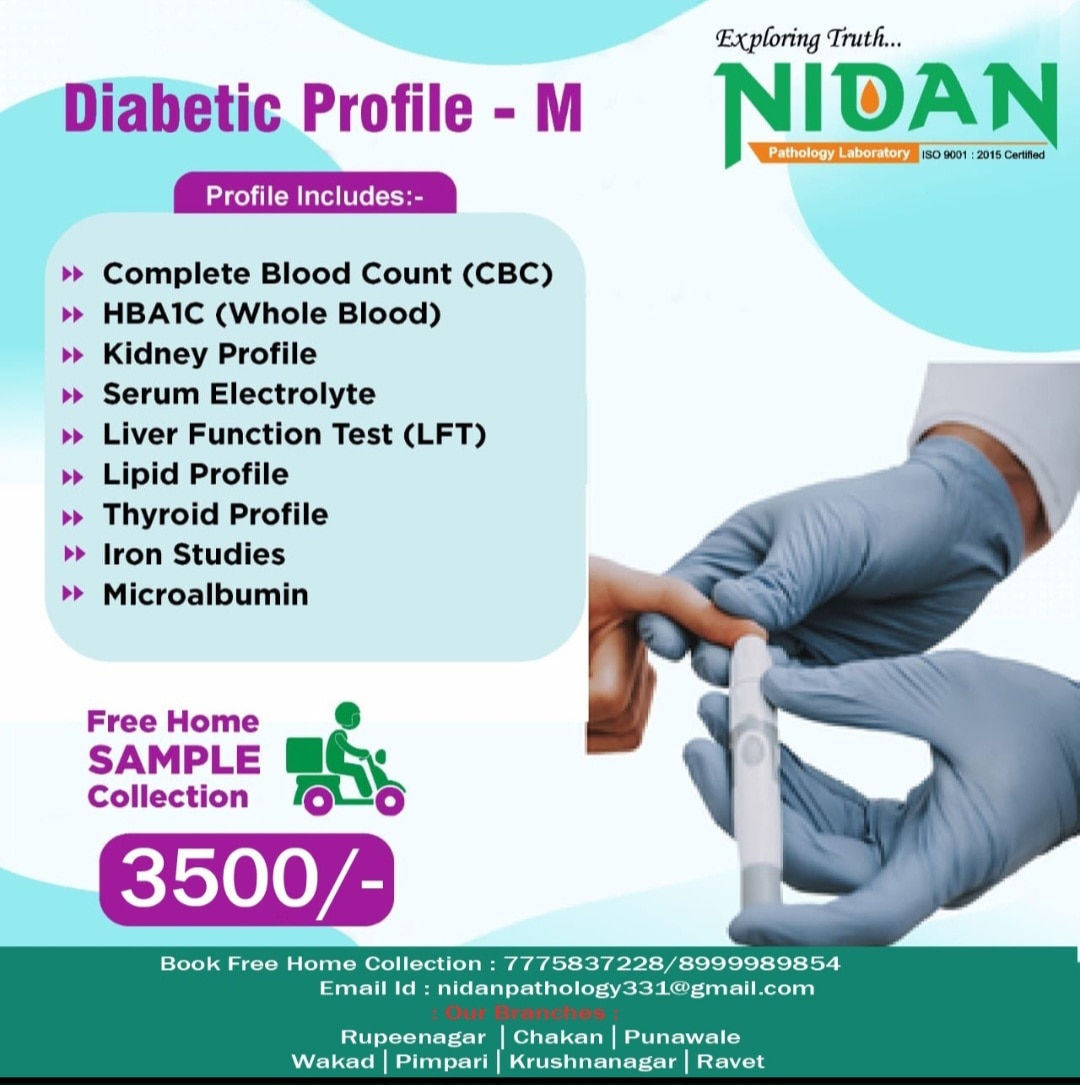 A "diabetic profile test" is a package of blood and urine tests used to diagnose, monitor, and manage diabetes and its related complications. It typically includes tests for Fasting Blood Glucose (FBG), Glycosylated Hemoglobin (HbA1c), Kidney Function Tests (KFT), Liver Function Tests (LFT), and a lipid profile to check cholesterol levels. These tests assess blood sugar control, evaluate kidney and liver health, and check for heart disease risk factors, with some profiles including tests for autoimmune markers or thyroid function for more comprehensive management Welcome to Nidan Pathology Laboratory, your trusted partner in comprehensive healthcare services., we specialize in delivering accurate pathology blood tests and preventive health check packages. Our commitment lies in providing accessible healthcare solutions to the residents of Pimpri Chinchwad Pune city. With a focus on convenience and affordability, we offer free home collection services, ensuring that healthcare remains convenient and accessible to all. Experience quality healthcare services at affordable prices with Nidan Pathology Laboratory – your trusted healthcare partner in Pimpri Chinchwad Pune. We are fast growing health care organization. A pioneer in the health care arena, Nidan Pathology Laboratory has been at the fore front of world class health care services. Our fundamental mission is to propagate healthier living for all our citizen. Nidan Pathology Laboratory is doing a pivotal role in raising the bar of health diagnostic accuracy, technological equipment, customer experience and research-driven empathetic service in the health industry. The company runs health care services like-: pharmaceutical, herbal & nutraceutical company, other hand company also working with hospitals & clinic, diagnostics, ambulance services, blood bank, ngo, old age home care, pet care & medicine, nursing services, online medicine, online consultation, and also work with concept of health care @ the home services. In our country the healthcare industry is undergoing a revolutionary change due to the increasing awareness about lifestyle disease, growth in gdp, knowledge about preventive healthcare, growing health insurance market, and growing government expences on healthcare. Why Choose Nidan Pathology Laboratory? Regular checkups are an essential part of maintaining good health. At our pathology lab, we offer a comprehensive range of services to help you stay on top of your health game. Our team of experts is committed to providing you with the highest level of care and support, using the latest technology and techniques. Mission, Vision, Value MISSION A reliable, one-stop-solution for all healthcare needs of all categories of patients. To create impact by becoming an active participant in local community initiatives and contribute to its well-being and development. Vision At Nidan Pathology Laboratory we aim to dedicate ourselves to human care through excellence in health care services and improving health standards through preventive care. Value QUALITY EFFICIENCY COST INNOVATION DEPENDABILITY SPEED