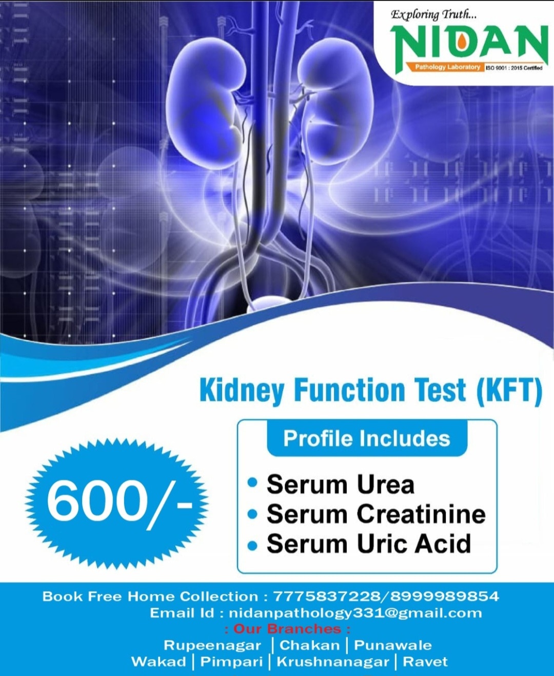 Blood tests used to investigate liver, thyroid or kidney ...A kidney profile test, also known as a Renal Function Test (RFT) or Kidney Function Test (KFT), is a series of blood and urine tests used to evaluate how well your kidneys are working by measuring waste products, electrolytes, and protein levels, and estimating the glomerular filtration rate (eGFR). Common tests include serum creatinine and Blood Urea Nitrogen (BUN) to check for waste buildup, and urinalysis for protein or blood in the urine Welcome to Nidan Pathology Laboratory, your trusted partner in comprehensive healthcare services., we specialize in delivering accurate pathology blood tests and preventive health check packages. Our commitment lies in providing accessible healthcare solutions to the residents of Pimpri Chinchwad Pune city. With a focus on convenience and affordability, we offer free home collection services, ensuring that healthcare remains convenient and accessible to all. Experience quality healthcare services at affordable prices with Nidan Pathology Laboratory – your trusted healthcare partner in Pimpri Chinchwad Pune. We are fast growing health care organization. A pioneer in the health care arena, Nidan Pathology Laboratory has been at the fore front of world class health care services. Our fundamental mission is to propagate healthier living for all our citizen. Nidan Pathology Laboratory is doing a pivotal role in raising the bar of health diagnostic accuracy, technological equipment, customer experience and research-driven empathetic service in the health industry. The company runs health care services like-: pharmaceutical, herbal & nutraceutical company, other hand company also working with hospitals & clinic, diagnostics, ambulance services, blood bank, ngo, old age home care, pet care & medicine, nursing services, online medicine, online consultation, and also work with concept of health care @ the home services. In our country the healthcare industry is undergoing a revolutionary change due to the increasing awareness about lifestyle disease, growth in gdp, knowledge about preventive healthcare, growing health insurance market, and growing government expences on healthcare. Why Choose Nidan Pathology Laboratory? Regular checkups are an essential part of maintaining good health. At our pathology lab, we offer a comprehensive range of services to help you stay on top of your health game. Our team of experts is committed to providing you with the highest level of care and support, using the latest technology and techniques. Mission, Vision, Value MISSION A reliable, one-stop-solution for all healthcare needs of all categories of patients. To create impact by becoming an active participant in local community initiatives and contribute to its well-being and development. Vision At Nidan Pathology Laboratory we aim to dedicate ourselves to human care through excellence in health care services and improving health standards through preventive care. Value QUALITY EFFICIENCY COST INNOVATION DEPENDABILITY SPEED